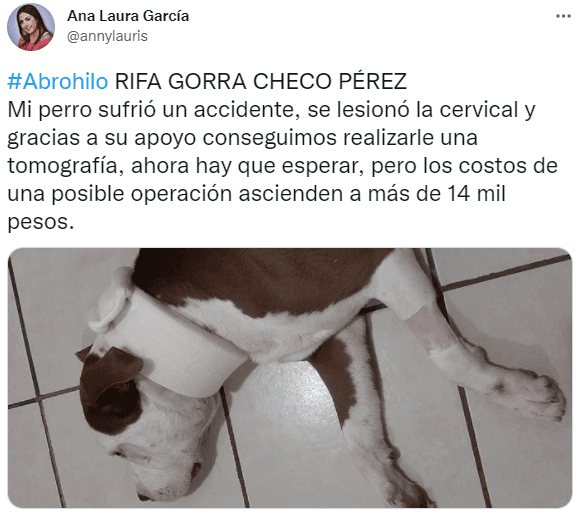 A través de su cuenta de Twitter, la usuaria Ana Laura García reveló que su perro había sufrido un accidente, ypara poder afrontar los altos gastos de una posible operación para recuperarlo, ofreció subastar la gorra del piloto mexicano de Red Bull Racing que hoy se encuentra realizando una gran temporada en la F1. ¿El costo del boleto? 50 pesos mexicanos.