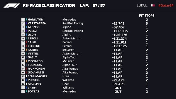 En la jornada de ayer se llevó a cabo el Gran Premio de Qataren elCircuito Internacional de Losail, en donde Lewis Hamilton tuvo un desempeño implacable y se hizo con una nueva victoria. Max Verstappen volvió a quedar segundo, por lo que la tabla de pilotos se sigue apretando a tan solo 2 fechas para el final de temporada. Sergio Pérez, por su parte, se tuvo que conformar con el cuarto puesto ya que Fernando Alonso cerró el podio.