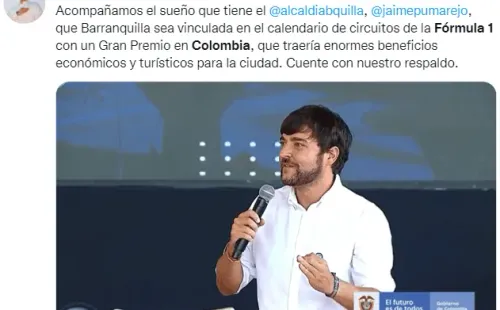 La ciudad de Barranquilla comenzó negociaciones con la organización de la F1, Liberty Media, para construir un autódromo y así posicionarse como sede de la máxima categoría del automovilismo. Así lo anunciaron dos importantes autoridades gubernamentales del país cafetero, incluído el presidente, Iván Duque. El mandamás confirmó las pláticas iniciadas por elalcalde de Barranquilla, Jaime Pumarejo.