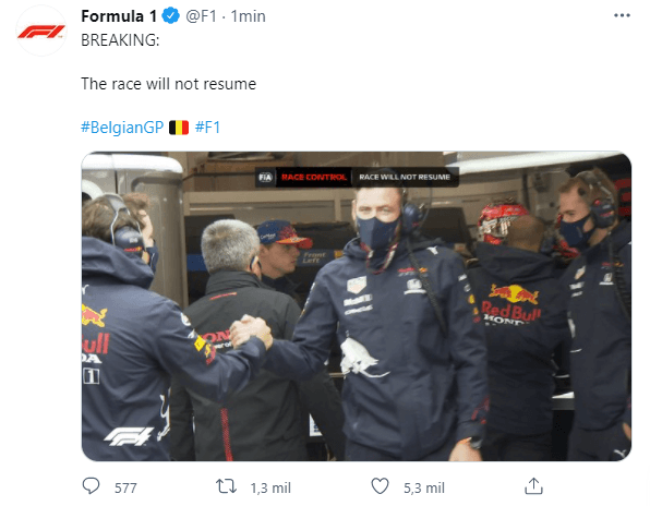 Durante más de cuatro horas en relación al horario en que estaba prevista la largada se mantuvo la incertidumbre sobre si finalmente se correría o no el Gran Premio de Bélgica en la Fórmula 1, sin que existiera ningún comunicado oficial de la organización al respecto y sin que los pronósticos climáticos demostraran que la intensa lluvia fuera a menguar.