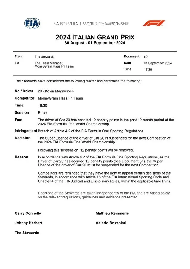 “De acuerdo con el Artículo 4.2 del Reglamento Deportivo de Fórmula Uno de la FIA, como el piloto del coche 20 ha acumulado 12 puntos de penalización, la Superlicencia del piloto del coche 20 debe ser suspendida para la próxima competición“, reza el comunicado publicado por la FIA.