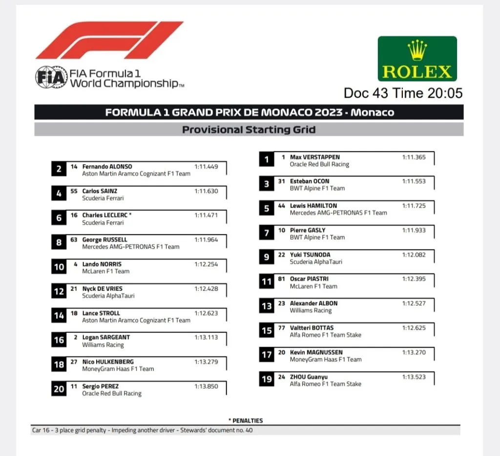 Grilla de partida del GP de Mónaco 2023