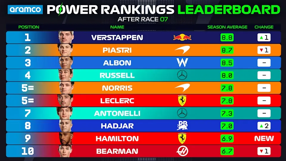 Como podía esperarse, gracias al 10 conseguido por Max Verstappen de acuerdo a los jueces de la Fórmula 1, ahora el neerlandés se convirtió en el líder del Power Ranking al avanzar una posición. Oscar Piastri, quien venía encabezando esta lista, retrocedió un puesto y ahora quedó 2°.