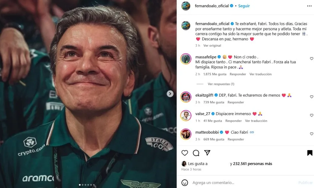 Por su parte, Aston Martin -última escudería en la que se lo vio a Borra- se pronunció en redes sociales luego de la dolorosa noticia. “Nos entristece profundamente el fallecimiento de Fabrizio Borra, figura de confianza de Fernando durante muchos años. Acompañamos en el sentimiento a su familia, amigos y a todos los que lo conocieron”, escribió el equipo en X.