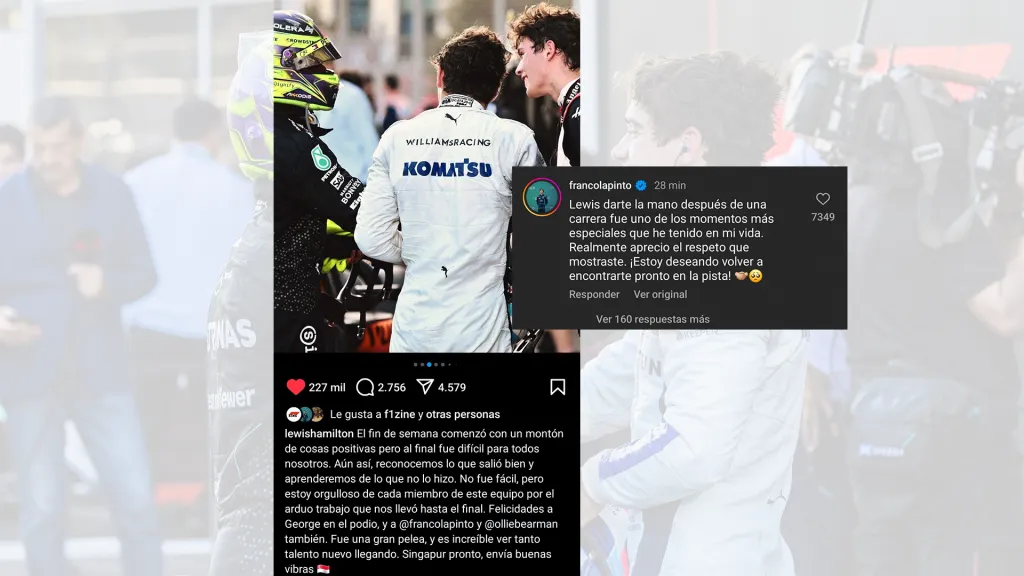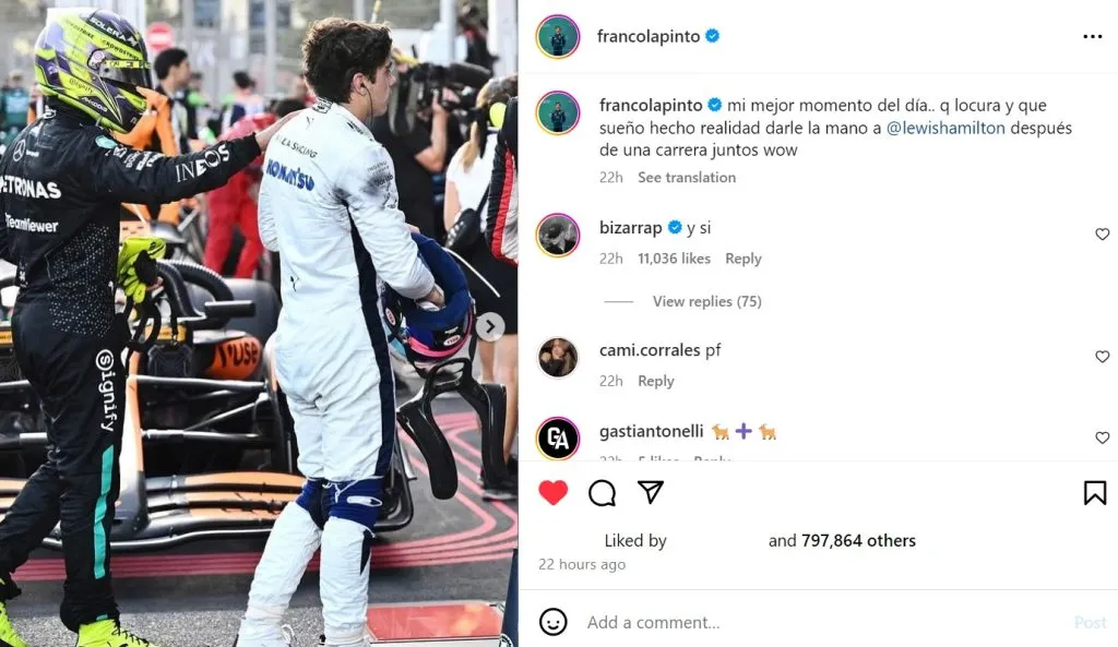 En cuanto a Franco, se mostró muy contento por el gesto de Lewis, tanto así que publicó la foto del momento del saludo en Instagram y escribió: “Mi mejor momento del día.. qué locura y qué sueño hecho realidad darle la mano a @lewishamilton después de una carrera juntos wow“. Ahora bien, eso no quedó allí, ya que el propio Hamilton también le dedicó un posteo.