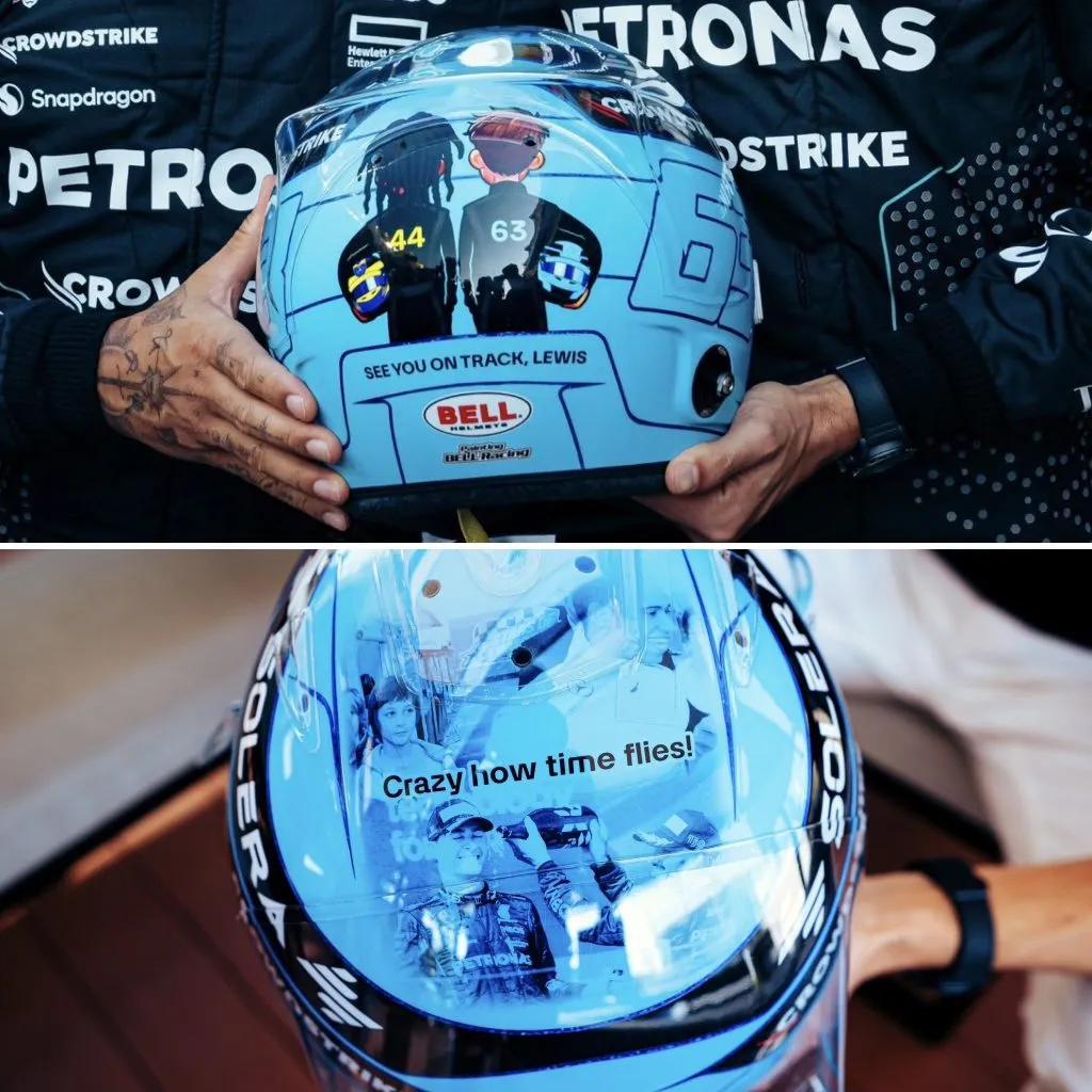 Como no podía ser de otra manera, su despedida fue más que emotiva en el Gran Premio de Abu Dhabi. Lewis se ha ganado el respeto de toda la parrilla y uno de los primeros homenajes llegó de su compañero de equipo, George Russell. Puntualmente, el británico diseñó un casco especial con fotos e ilustraciones de ambos, así como también frases como: “Nos vemos en la pista”.