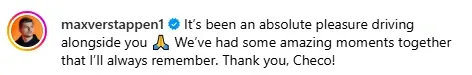 Tras confirmarse la salida de Sergio de Red Bull para el año próximo, el piloto neerlandés le dedicó una publicación en las redes sociales. “Fue un placer absoluto conducir a tu lado. Tuvimos momentos maravillosos juntos, los cuales siempre recordaré. ¡Gracias, Checo!”, escribió el campeón del mundo.