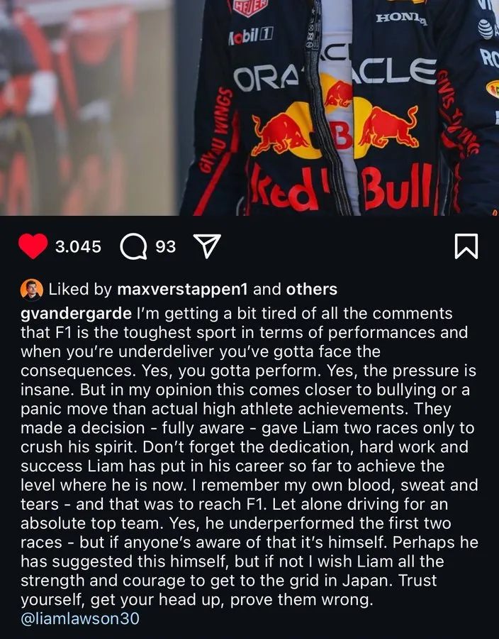 El expiloto Giedo van der Garde hizo un extenso posteo dedicado a Lawson que recibió el ‘like’ de Verstappen. En el mismo, escribió: “Me estoy cansando un poco de todos los comentarios de que la F1 es el deporte más duro en términos de actuaciones y cuando no tienes entrega tienes que afrontar las consecuencias. Sí, tienes que actuar. Sí, la presión es una locura. Pero en mi opinión esto se acerca más a la intimidación o a un movimiento de pánico que a los verdaderos logros del atleta“.