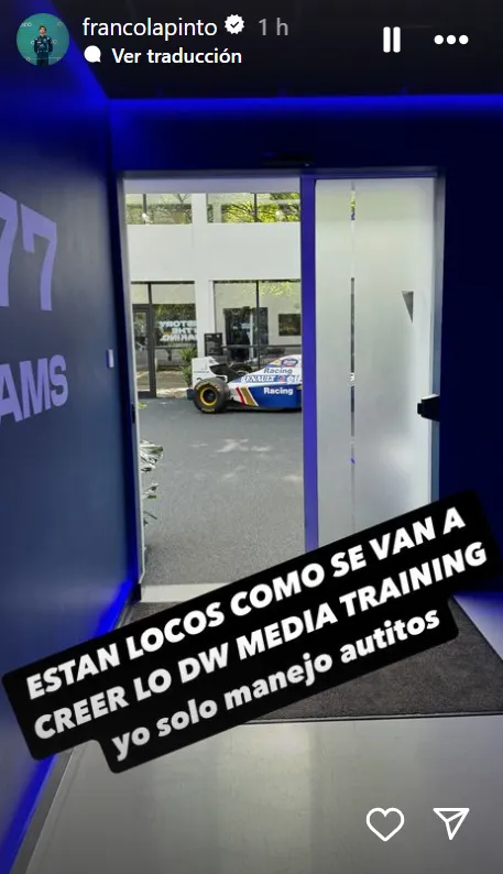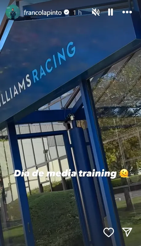 Franco Colapinto comenzó el día publicando un video en sus historias en el que filma una entrada ploteada de Williams, acompañado del texto “Día de media training” y un emoji de cara derretida.