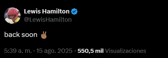 Hamilton dejó en claro que continuará corriendo, al menos hasta que termine el año, con dos palabras: “Back soon”. En español: “Vuelvo pronto”. De esta manera, el siete veces campeón de la Fórmula 1 confirmó su regreso a las pistas luego de aquellas enigmáticas declaraciones en Hungría.