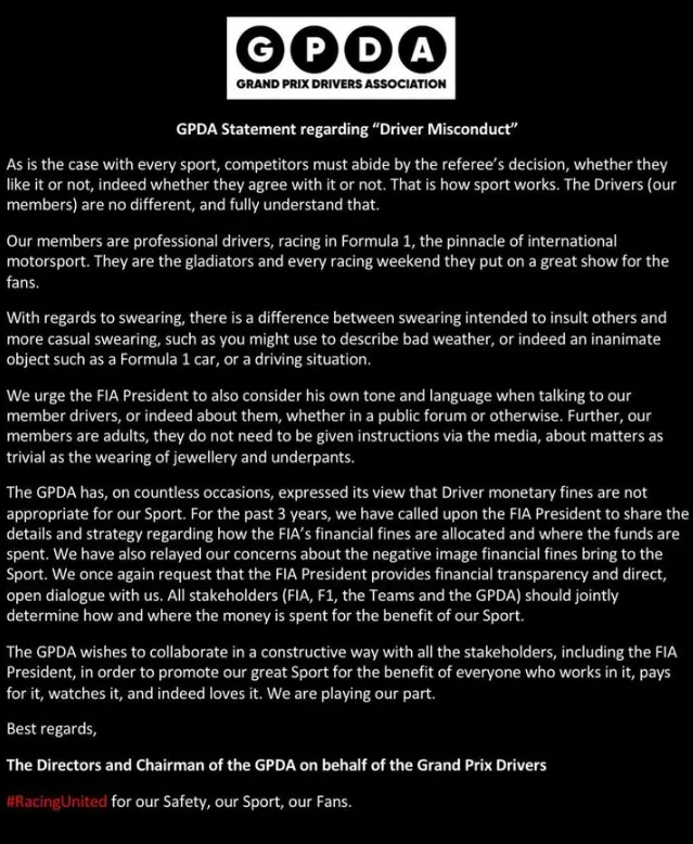 La GPDA ha expresado en innumerables ocasiones su opinión de que las multas monetarias a los pilotos no son apropiadas para nuestro deporte. Durante los últimos 3 años, hemos pedido al presidente de la FIA que comparta los detalles y la estrategia sobre cómo se asignan las multas financieras de la FIA y dónde se gastan los fondos. También hemos transmitido nuestras preocupaciones sobre la imagen negativa que las multas financieras dan al deporte. Una vez más, solicitamos al presidente de la FIA que brinde transparencia financiera y un diálogo directo y abierto con nosotros. Todas las partes interesadas (FIA, F1, los equipos y la GPDA) deben determinar conjuntamente cómo y dónde se gasta el dinero en beneficio de nuestro deporte.