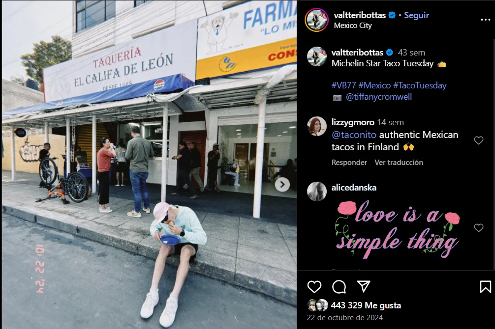 Bottas también sorprendió fuera de la pista: es fanático de los tacos mexicanos. Durante una competencia en México no pudo resistirse a probarlos y dijo: “Para mí el Taco Tuesday es como una religión, y los jalapeños son importantes: que sean cinco, no cuatro ni seis”. Un detalle que lo acercó al público mexicano.