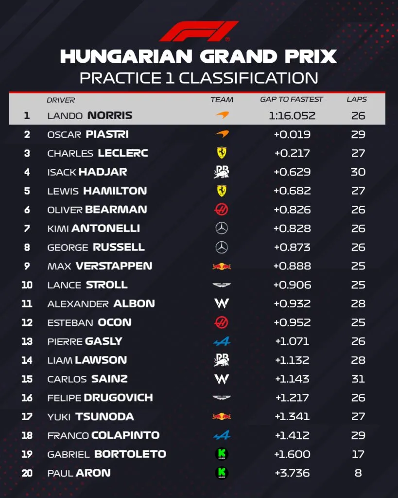 Resultado de la Práctica Libre 1 del GP de Hungría 2025