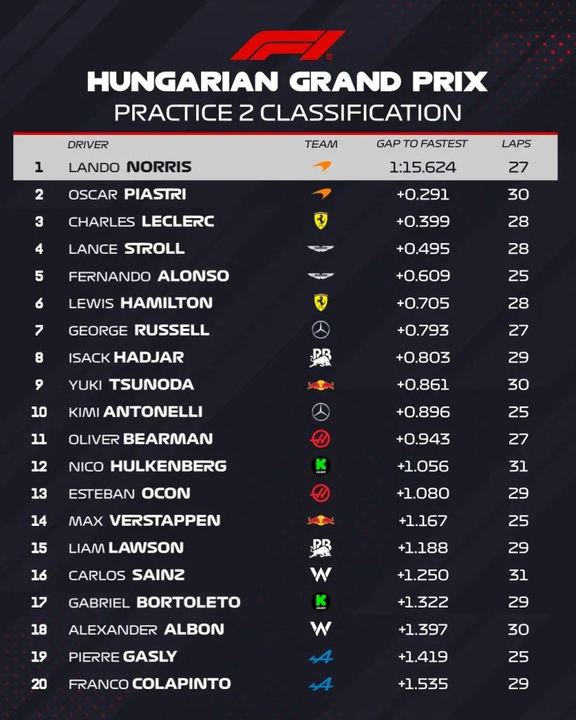 Resultado de la Práctica Libre 2 del GP de Hungría 2025