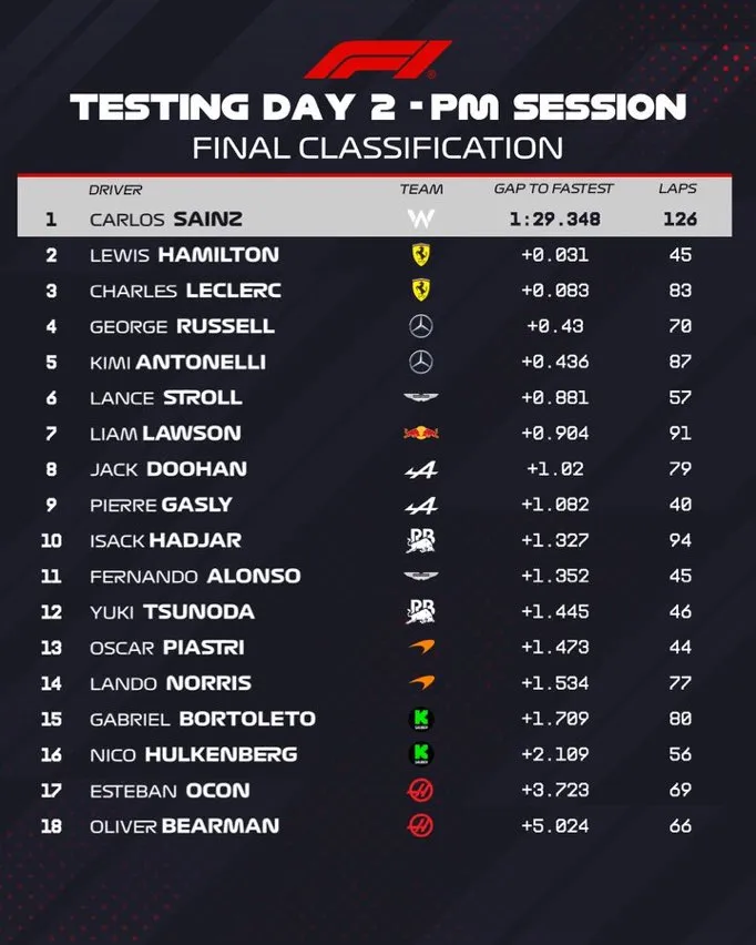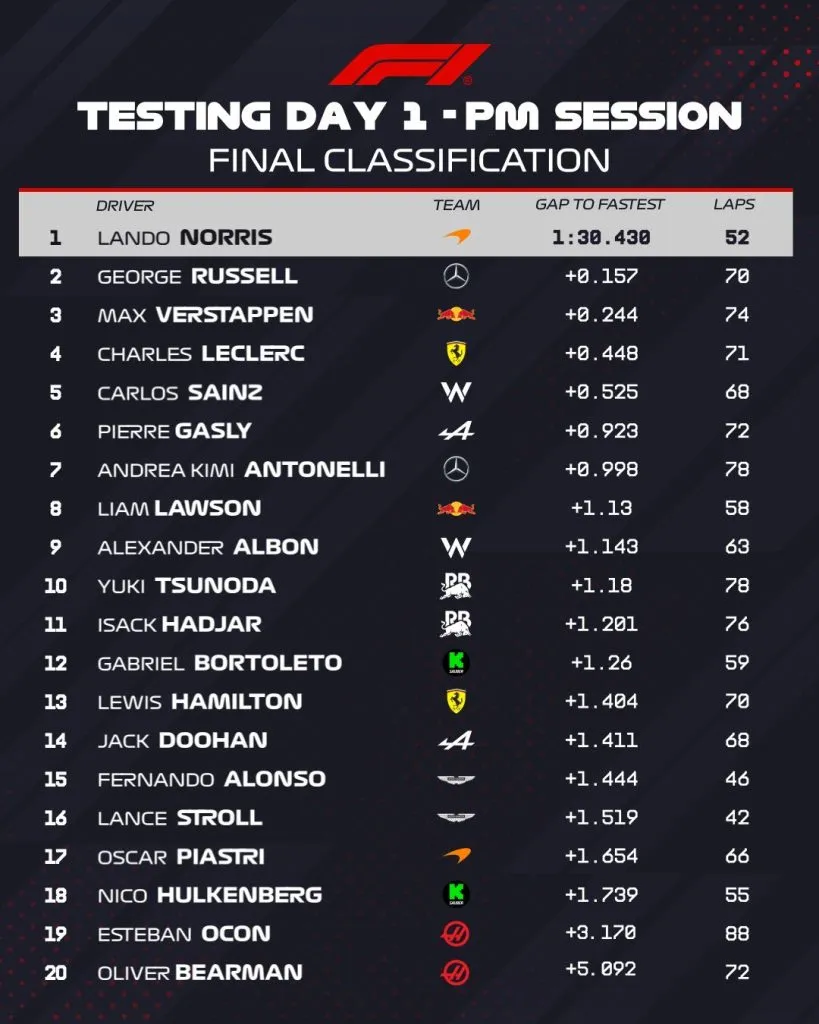 Fin la de pretemporada 2025 de la Fórmula 1 en Bahrein. Los pilotos titulares de las 10 escuderías tuvieron la oportunidad de rodar con los nuevos coches en el Circuito de Sakhir durante tres días para sacar las últimas conclusiones y ya quedó todo listo para el inicio oficial de la nueva campaña. A continuación, conoce los resultados de las tres jornadas.