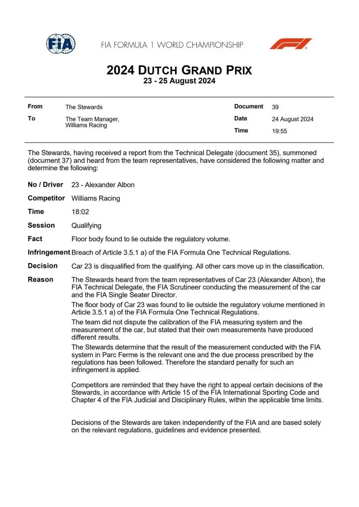El caso de Alex fue más complejo. El tailandés había terminado 8° en la Clasificación y tenía grandes chances de sumar algún punto para su equipo tras el incidente de Logan Sargeant. Sin embargo, tras la Qualy se constató que el suelo de su coche estaba fuera del volumen reglamentario y la FIA lo descalificó. De esta manera, Albon largará último y Williams tendrá a sus dos pilotos en el fondo de la parrilla.