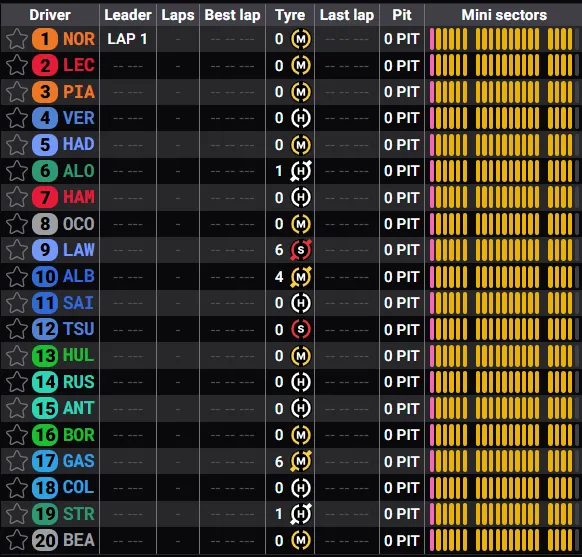 Luego de las paradas, el podio provisional se mantiene con Lando Norris, Charles Leclerc y Oscar Piastri. Franco Colapinto marcha 19°, pero ya hizo las dos paradas obligatorias y es un hecho que subirá algunas posiciones.