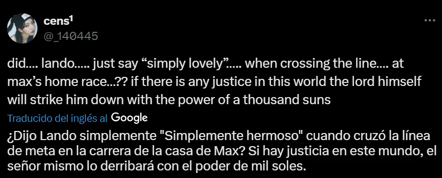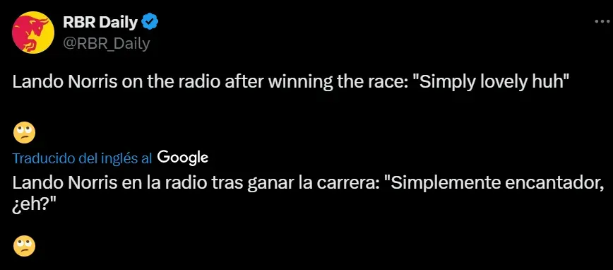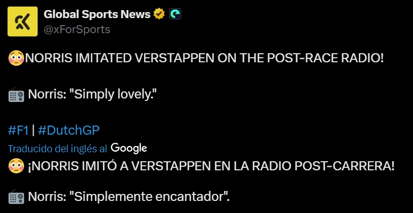 Segundos después de la bandera a cuadros en Zandvoort, Lando Norris dijo: “Simply lovely, huh?”. Para muchos esto pasó desapercibido, pero “simply lovely” se trata de la frase de cabecera de Max Verstappen cuando obtiene una victoria en la Fórmula 1. Como era de esperarse, los aficionados del tricampeón salieron a criticar a Lando en redes sociales.