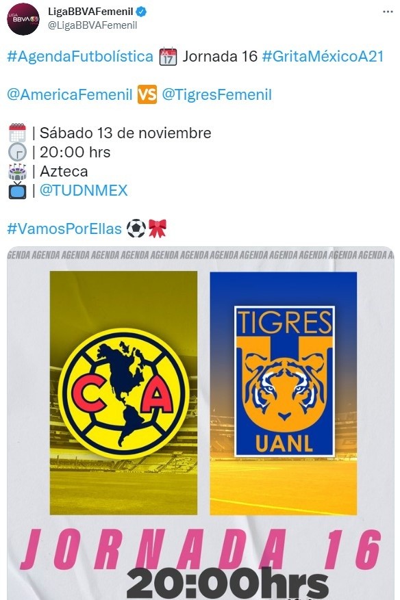 Siguiendo con el desarrollo de una nueva fecha del fútbol femenino mexicano, la realidad es que uno de partidos tendráaTigres UANLchocando contraAméricapor la decimosextajornada del Torneo Grita México Apertura 2021 de laLiga FemenilMX. Eljuego tiene fecha de disputa pactada para elsábado 13 de noviembre, el cual tendrá lugar en el Estadio Aztecacon horario pactado a las20:00 horas CDMX. El mismo será transmitido EN VIVO y EN DIRECTOpor TUDN.