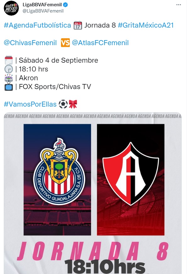 Continúa desempeñándose un nuevo capítulo en lo que tiene que ver con el fútbol femenino de México. En este caso, las punterasChivas de Guadalajarajugarán frente aAtlaspor la octava jornada del Torneo Grita México Apertura 2021 de laLiga FemenilMX. Este juego tiene fecha de disputa pactada para este sábado 4 de septiembre, el cual tendrá lugar en el Estadio Akroncon horario pactado a las18:10 horas CDMX. El mismo será transmitido EN VIVO y EN DIRECTOporEN VIVO y EN DIRECTO en México a través de FOX Sports 2, Fanatizy Chivas TV.