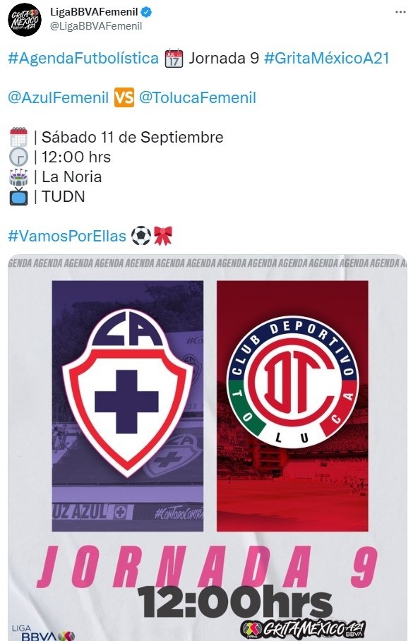 Dentro de lo que es una nueva cita en el campeonato de mujeres en la primera división futbolística en México,en este casoCruz Azulestará chocando contra Tolucapor la novena jornada del Torneo Grita México Apertura 2021 por laLiga FemenilMX. Este juego tiene fecha de disputa pactada para HOY,sábado 11 de septiembre, el cual tendrá lugar en las Instalaciones de La Noriacon horario pactado a las12:00 horas CDMX. El mismo será transmitido EN VIVO y EN DIRECTOporTUDN.
