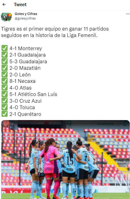Tigres UANL está realizando una magnífica campaña en lo que va del Torneo Grita México Apertura 2021 de la Liga MX Femenil. En su última jornada, lograron imponerse por 2-1 ante Querétaro en condición de visita y rompieron un récord histórico en el fútbol femenino: 11 partidos ganados de forma consecutiva.