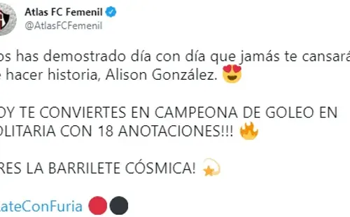 “Nos has demostrado día con día que jamás te cansarás de hacer historia, Alison González.Hoy te conviertes en Campeona de Goleo en solitaria con 18 anotaciones. ¡Eres la Barrilete Cósmica!”, presumió Atlas después de que la futbolista nacida en Tepic Nayarit, consumara la hazaña en la Liga MX Femenil.
