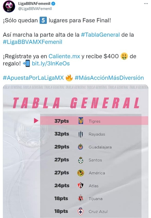 Lo que se mantiene esel cómodo liderato de Tigres UANLdel certamen totalizando 37 unidades, siendo perseguidas por lasRayadascon 32,Chivascon 29, masSantos LagunayAméricacerrando el Top 5 de 27 puntos, pero principalmente sabiendo que los mencionados ya tienen asegurado su lugar en la liguilla. Restan determinar los otros tres lugares que aún no tienen definición desde lo numérico.