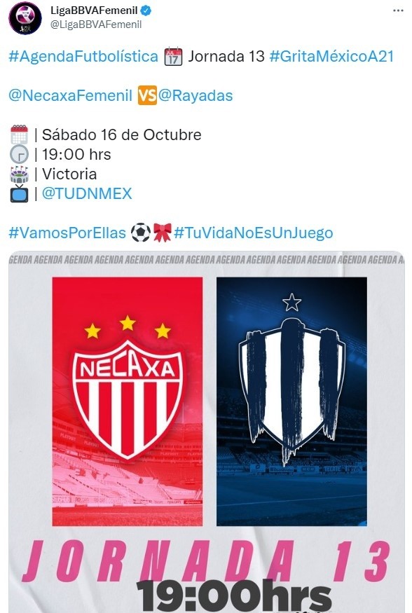 Siguiendo con el desarrollo de una nueva fecha del fútbol femenino mexicano, la realidad es que uno de losvedaderospartidazos tendráaRayadas de Monterreychocando contra Necaxapor la 13° jornada del Torneo Grita México Apertura 2021 de laLiga FemenilMX. Eljuego tiene fecha de disputa pactada para HOY,sábado 16 de octubre, el cual tendrá lugar en el Estadio Victoriacon horario pactado a las19:00 horas CDMX. El mismo será transmitido EN VIVO y EN DIRECTOpor TUDN.