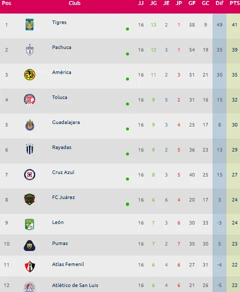 - Siete equipos ya aseguraron su lugar en la Liguilla: Tigres, Pachuca, América, Toluca, Chivas, Rayadas y Cruz Azul.