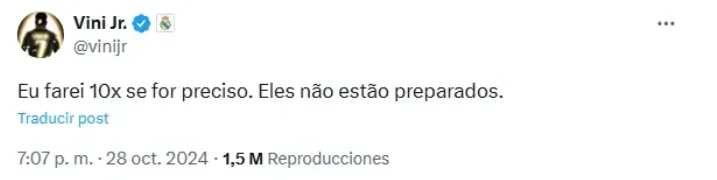 “Lo haré 10 veces si es necesario. Ellos no están preparados”, manifestó el delantero del Real Madrid, el cual no precisó contra quién o quiénes apuntó en su recado, en su cuenta de X (ex Twitter).