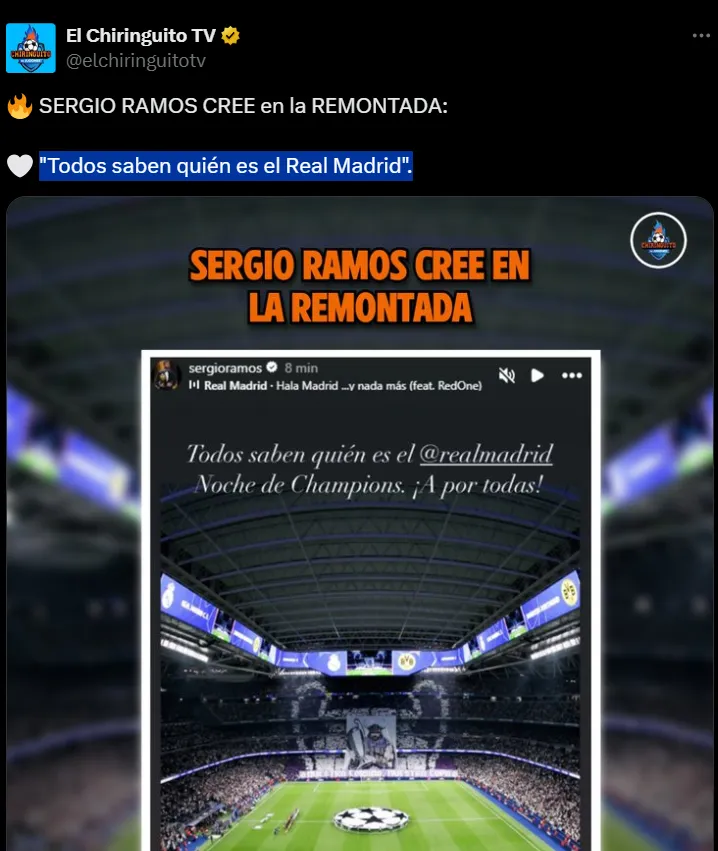 A través de sus redes sociales, publicó una frase que ilusionó a los madridistas: “Todos saben quién es el Real Madrid. Noche de Champions. ¡A por todas!”. Un mensaje corto, pero con todo el peso simbólico de quien fue líder y referente del club por más de una década.
