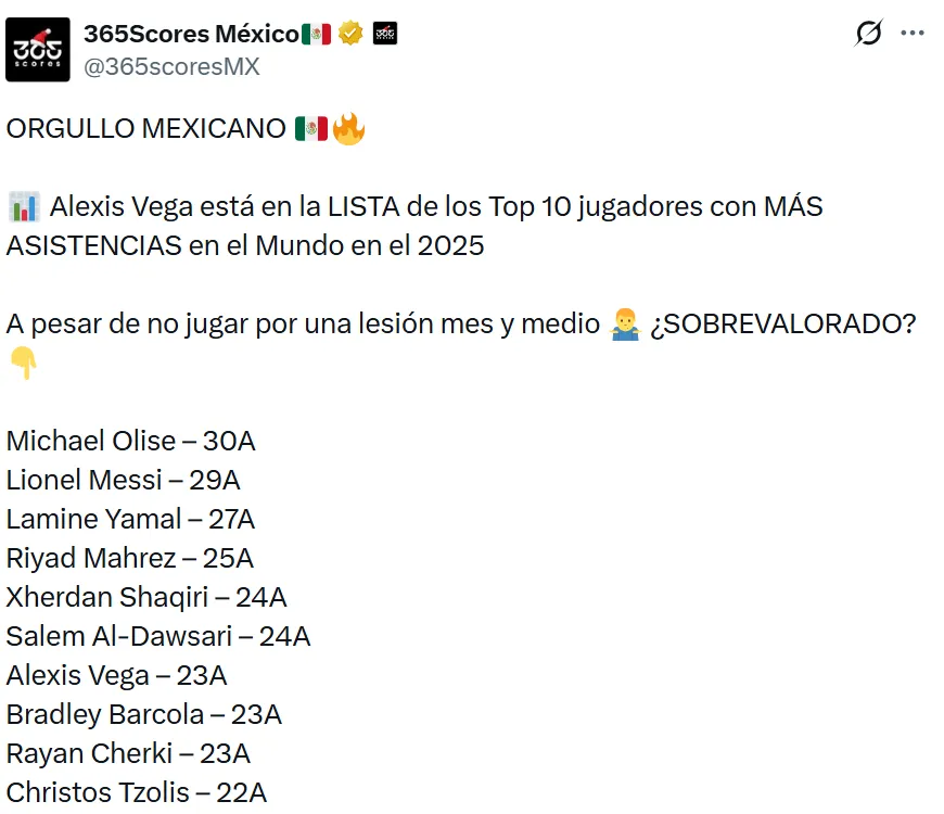 A pesar de la lesión y del tiempo sin actividad, Alexis Vega cerró el año con 23 asistencias, una cifra que lo coloca dentro de una lista de élite a nivel mundial. El mexicano aparece junto a figuras consagradas del futbol internacional, compartiendo ranking con jugadores que militan en las principales ligas de Europa.