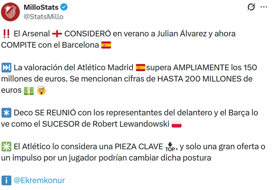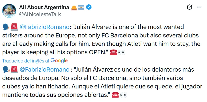 En esa misma línea, Fabrizio Romano también reveló el fuerte interés que existe por el delantero: “Julián Álvarez es uno de los delanteros más deseados de Europa. No solo el FC Barcelona, sino también varios clubes ya lo han fichado. Aunque el Atleti quiere que se quede, el jugador mantiene todas sus opciones abiertas”, expresó el periodista.