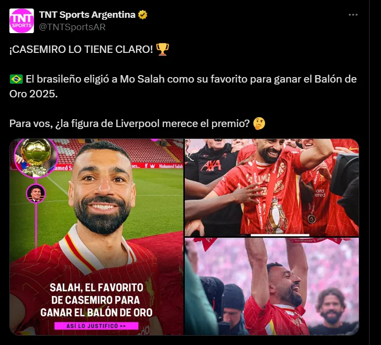 En el comienzo de la temporada pasada, muchos ya ponían a Salah como el ganador por como había arrancado el año, pero luego Liverpool y él no mostraron su mejor versión pese a ganar la Premier League. La opinión de Casemiro sorprendió porque muchos esperaban que el premio se lo llevara Lamine Yamal o Ousmane Dembélé, pero el brasileño eligió a quien considera que realmente tuvo el mayor impacto sobre el juego.