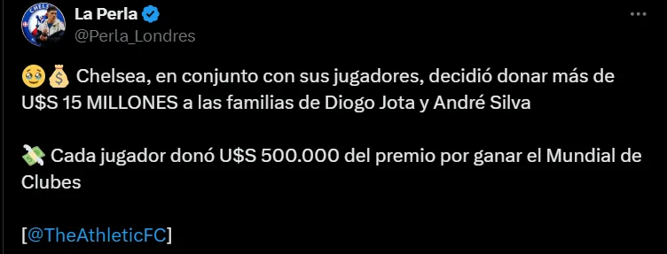 Según la información brindada por The Athletic, Chelsea decidió donar parte de su premio del Mundial de Clubes 2025, ganado el mes pasado tras vencer 3-0 al PSG en la final. La cifra supera los 15 millones de dólares, lo que significa que cada jugador aportó más de 500.000 dólares para las familias de Diogo Jota y su hermano André.