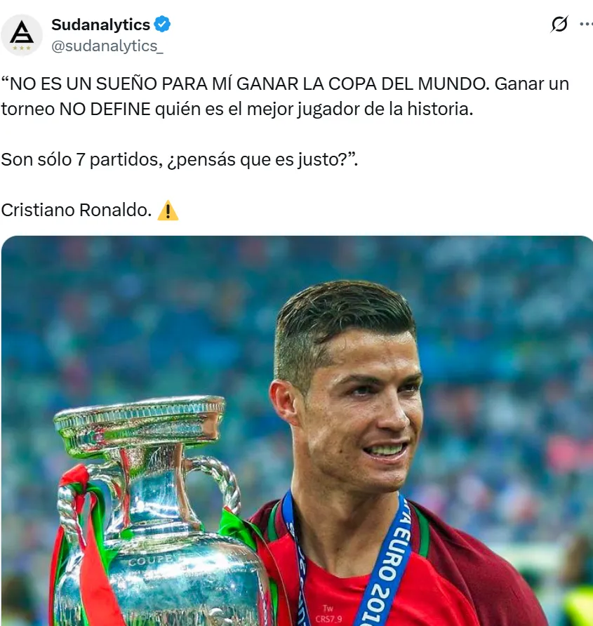 “No es un sueño para mí ganar la Copa del Mundo. Ganar un torneo no define quién es el mejor jugador de la historia. Son solo siete partidos, ¿pensás que es justo?”, declaró el portugués, enviando un claro mensaje sobre cómo percibe el legado y la comparación con otros grandes futbolistas.