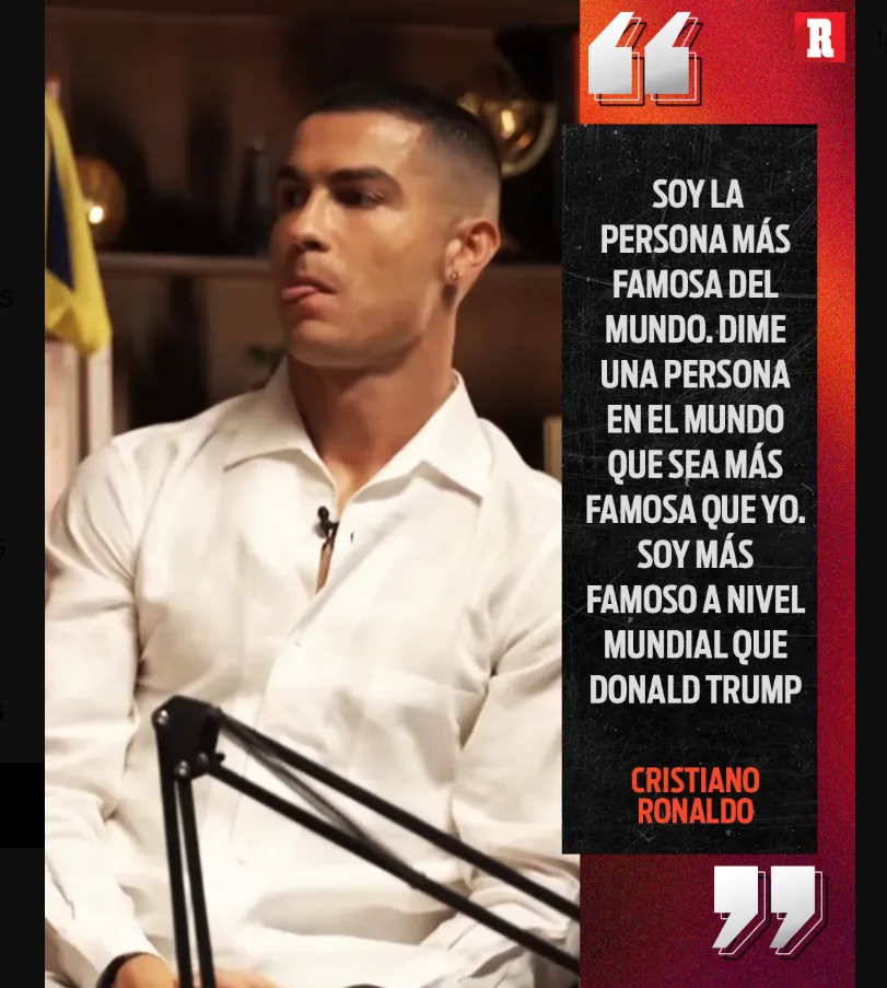 En la charla, el delantero portugués se autoproclamó la persona más famosa del mundo. “Soy la persona más famosa del mundo. Dime una persona en el mundo que sea más famosa que yo. Soy más famoso a nivel mundial que Donald Trump”, expresó con total confianza. Una frase que rápidamente se viralizó y generó miles de comentarios en redes sociales.