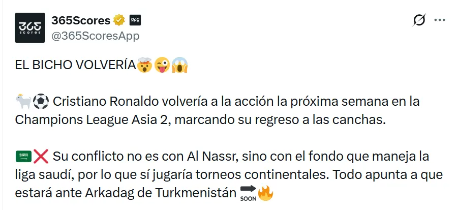 Cristiano Ronaldo regresaría a jugar este fin de semana. Al-Nassr visitará a Al-Fateh en una nueva jornada de la Saudi Pro League, desde las 11:30 horas de la CDMX, y se espera que CR7 se reincorpore al equipo en este encuentro que será vital en la lucha por el primer lugar de la tabla.