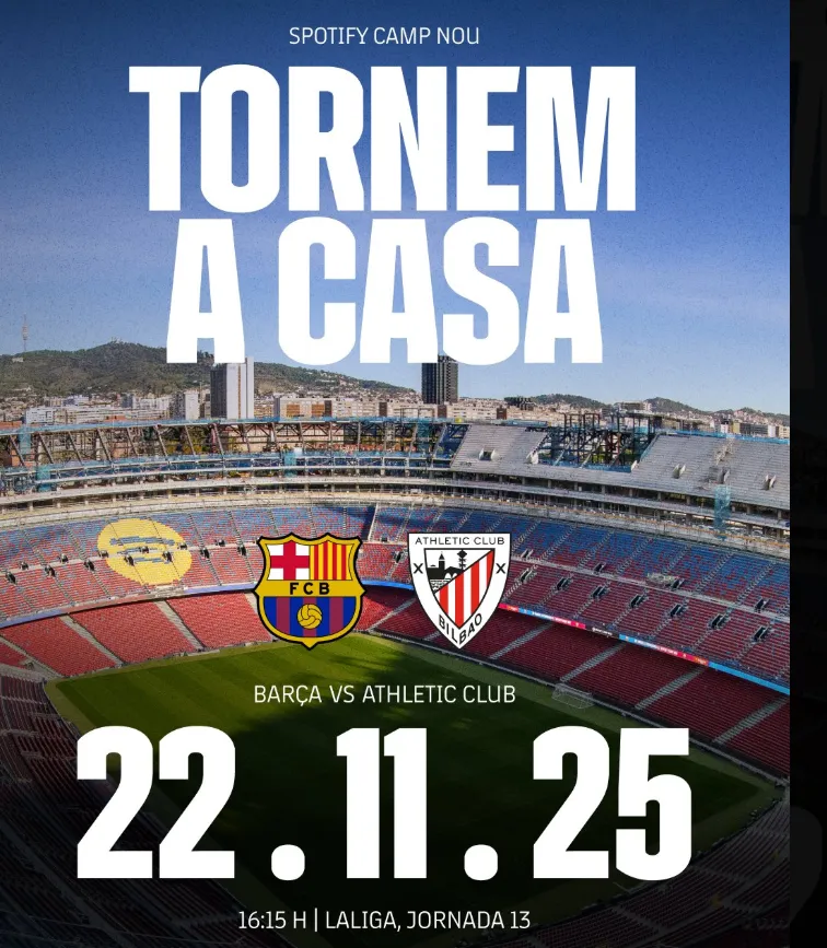 - Barcelona jugará en el Spotify Camp Nou el 22 de noviembre contra el Athletic Club de Bilbao.