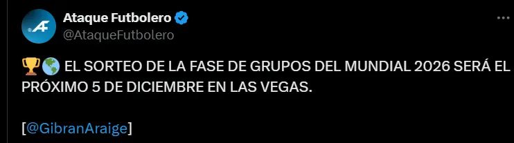 El periodista Gibrán Araige, que trabaja para TUDN, reveló que el sorteo será el próximo 5 de diciembre de este año y se llevará a cabo en Las Vegas, Estados Unidos. Si bien todavía falta el anuncio oficial por parte de FIFA, todo indica que ese será el día en que el mundo del futbol volverá a estar atento a un evento que marcará el comienzo del camino hacia el Mundial 2026.
