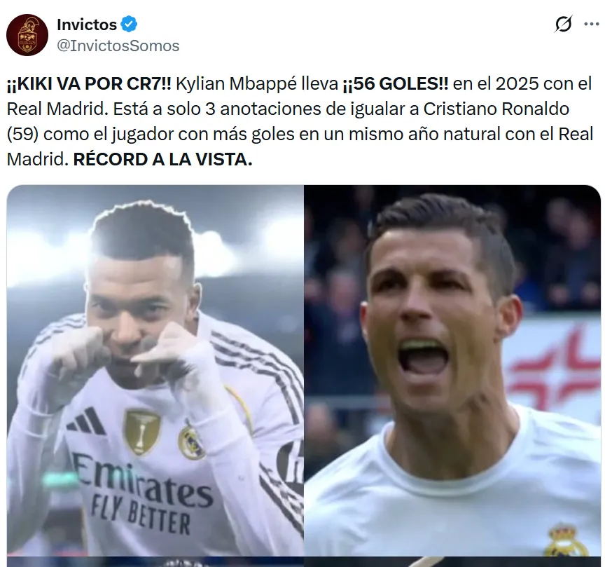 Con esos 56 goles, el delantero francés quedó a solo tres anotaciones de igualar la mejor temporada de Cristiano Ronaldo en el club blanco. El portugués estableció el récord con 59 goles en un mismo año natural, una marca que durante años parecía inalcanzable y que ahora está seriamente amenazada por Mbappé.
