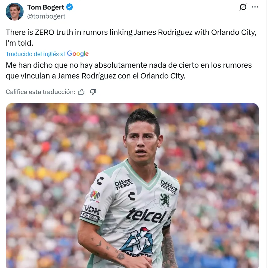 De acuerdo con la información publicada por el periodista Tom Bogert en The Athletic, el Orlando City no mantiene conversaciones ni negociaciones con el colombiano. “Me han dicho que no hay absolutamente nada cierto sobre los rumores que vinculan a James con el Orlando City”, explicó.