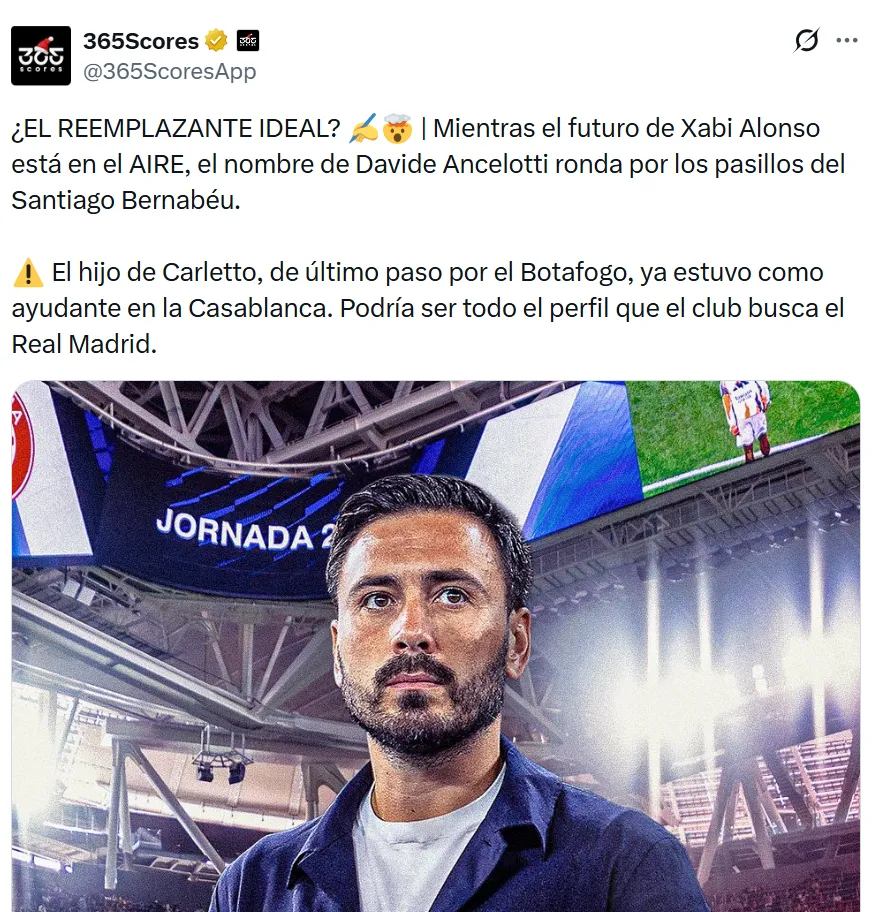 Davide Ancelotti, hijo de Carlo Ancelotti, ha surgido como una alternativa inesperada para dirigir al Real Madrid. Según 365 Scores, su nombre ha empezado a circular por los pasillos del Santiago Bernabéu mientras se define el futuro de Xabi Alonso, que continúa en la incertidumbre debido a los resultados obtenidos.