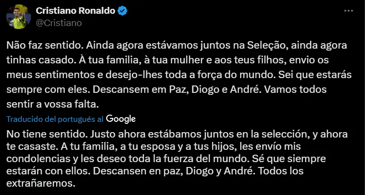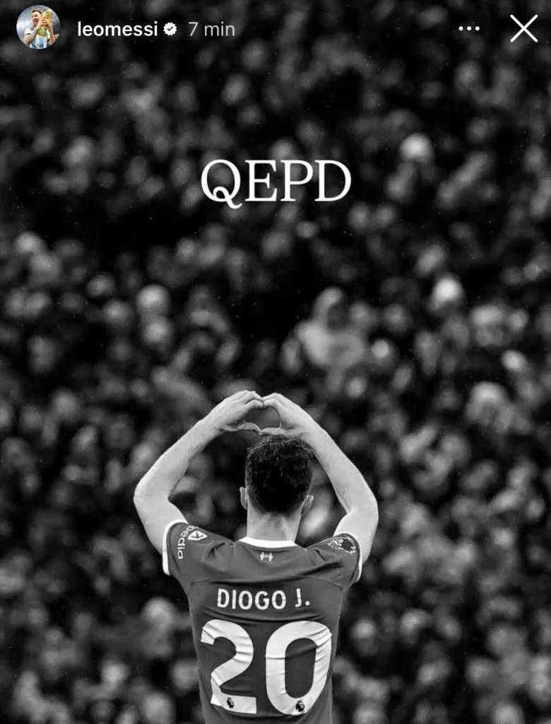 El mensaje de Lionel Messi fue breve al lado del de Cristiano Ronaldo pero emotivo, sin extenderse demasiado, ya que no había una amistad cercana entre ambos. El astro argentino escribió: “Qué en paz descanses”, acompañado de una foto de Diogo Jota.