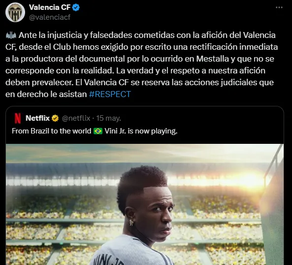 “La verdad y el respeto a nuestra afición deben prevalecer. El Valencia CF se reserva las acciones judiciales que en derecho le asistan”, escribió el club español en su cuenta de Twitter al citar una publicación oficial de Netflix relacionada al documental de Vinícius.