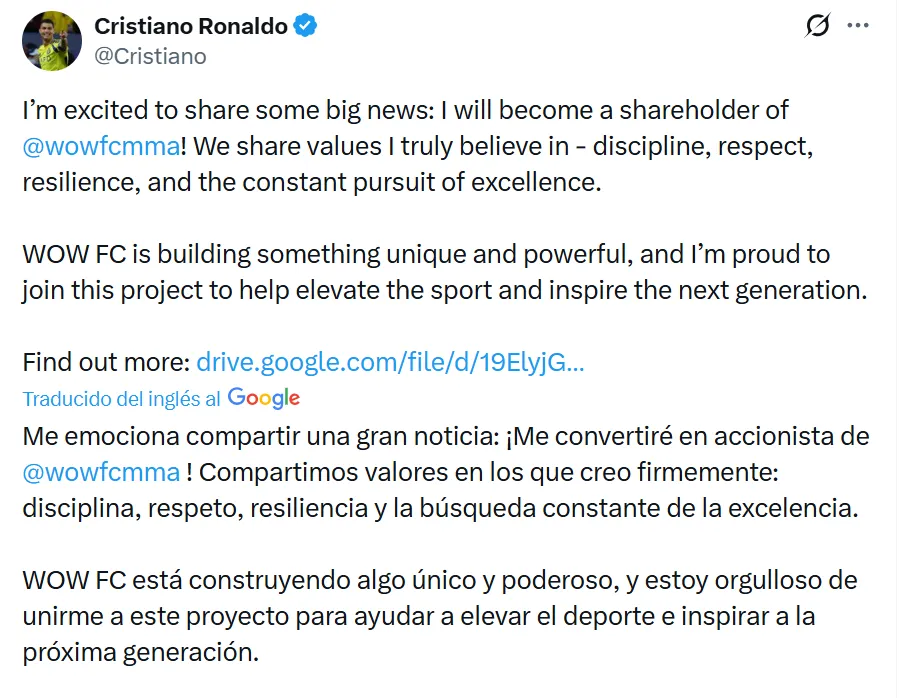 - El futbolista Cristiano Ronaldo anunció que se convertirá en accionista de la empresa WOW FC MMA.