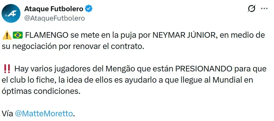 Según Matteo Moretto, Flamengo se ha sumado a la puja por Neymar Jr. en medio de las conversaciones sobre la renovación de su contrato con Santos. La intención del club brasileño sería aprovechar su talento y experiencia para fortalecer el equipo de cara a los próximos desafíos.