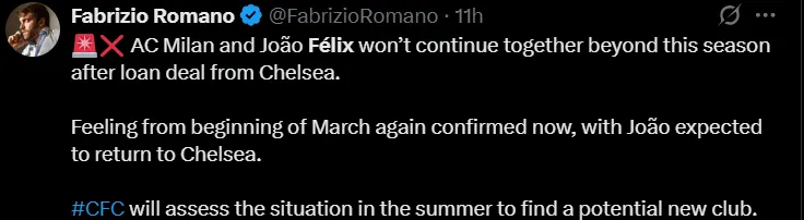 Ante este escenario, la directiva del conjunto lombardo ya estaría pensando a futuro con la mira puesta en los movimientos que podría tener su plantilla en el mercado de pases venideros. Al respecto, en las últimas horas el periodista especializado Fabrizio Romano reveló que el portugués Joao Félix es la primera baja confirmada de los Diablos para la próxima temporada.