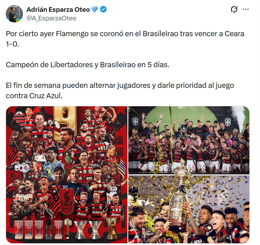 El Mengao no solo conquistó la Copa Libertadores el fin de semana pasado, sino que también aseguró el Brasileirao con una fecha de anticipación. Ese título temprano le da margen para rotar y resguardar a sus principales figuras antes del duelo frente a la Máquina.